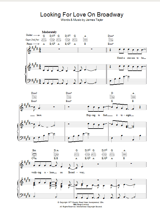 Download or print James Taylor Looking For Love On Broadway sheet music, chords and digital score arranged for Piano, Vocal & Guitar Chords. This Rock score includes 7 page(s).