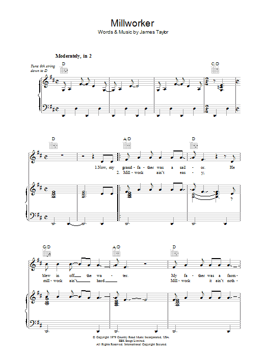 Download or print James Taylor Millworker sheet music, chords and digital score arranged for Piano, Vocal & Guitar Chords. This Rock score includes 8 page(s).
