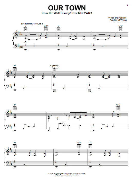 Download or print James Taylor Our Town (from Cars) sheet music, chords and digital score arranged for Piano, Vocal & Guitar Chords (Right-Hand Melody). This Children score includes 8 page(s).