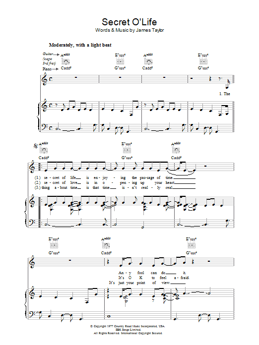 Download or print James Taylor Secret O'Life sheet music, chords and digital score arranged for Piano, Vocal & Guitar Chords. This Rock score includes 5 page(s).