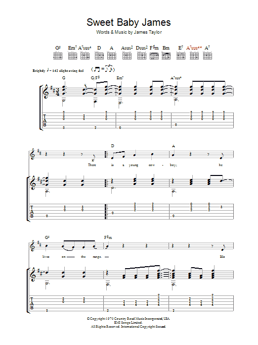 Download or print James Taylor Sweet Baby James sheet music, chords and digital score arranged for Piano, Vocal & Guitar Chords (Right-Hand Melody). This Pop score includes 4 page(s).