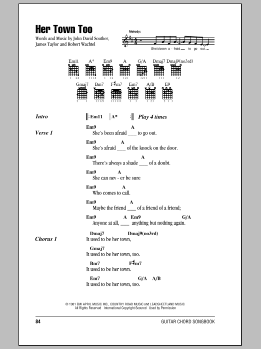 Download or print James Taylor with J.D. Souther Her Town Too sheet music, chords and digital score arranged for Piano, Vocal & Guitar Chords (Right-Hand Melody). This Pop score includes 8 page(s).