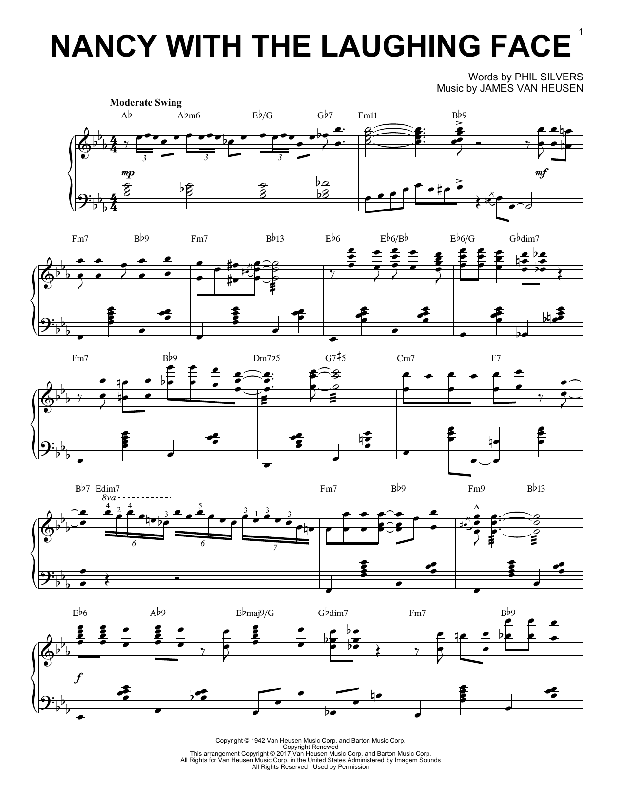 Download or print James Van Heusen Nancy With The Laughing Face [Jazz version] sheet music, chords and digital score arranged for Piano Solo. This Jazz score includes 4 page(s).