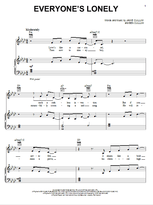 Download or print Jamie Cullum Everyone's Lonely sheet music, chords and digital score arranged for Piano, Vocal & Guitar Chords (Right-Hand Melody). This Jazz score includes 7 page(s).