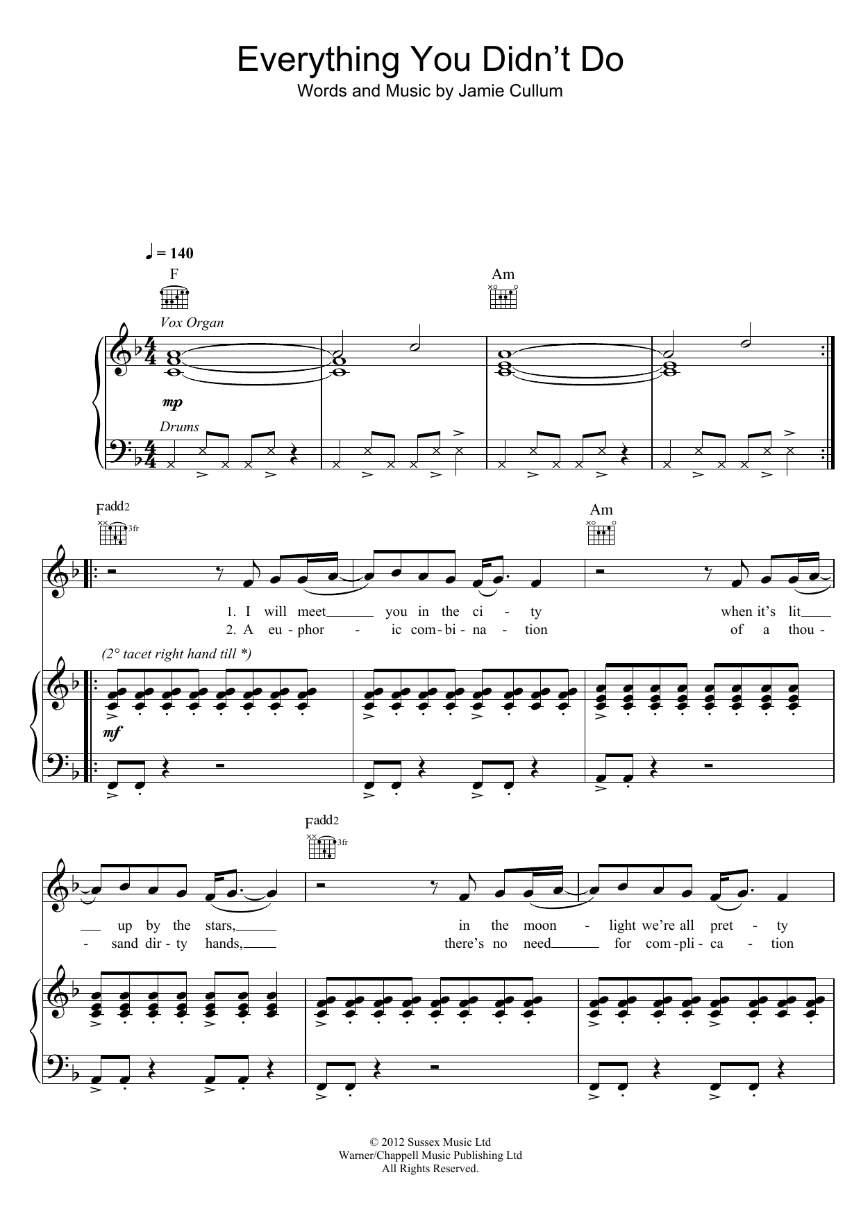 Download or print Jamie Cullum Everything You Didn't Do sheet music, chords and digital score arranged for Piano, Vocal & Guitar Chords (Right-Hand Melody). This Jazz score includes 7 page(s).
