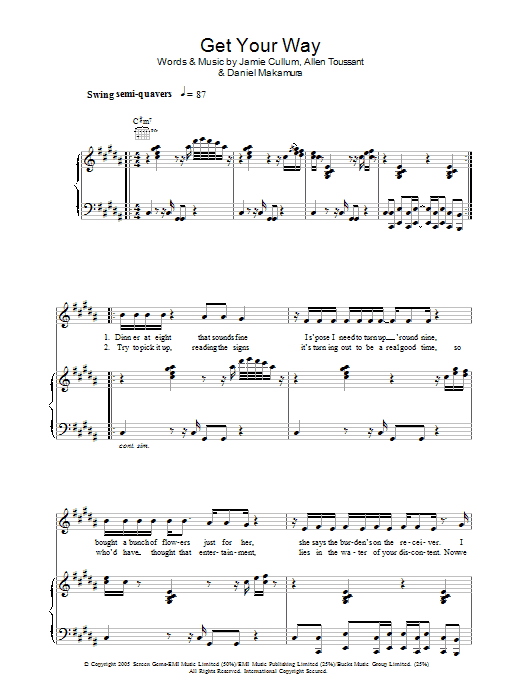 Download or print Jamie Cullum Get Your Way sheet music, chords and digital score arranged for Piano Solo. This Jazz score includes 4 page(s).