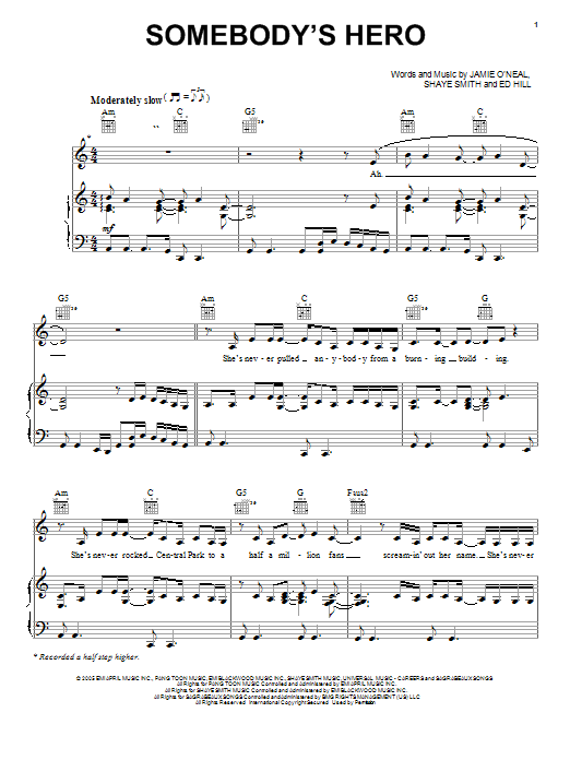 Download or print Jamie O'Neal Somebody's Hero sheet music, chords and digital score arranged for Piano, Vocal & Guitar Chords (Right-Hand Melody). This Country score includes 7 page(s).