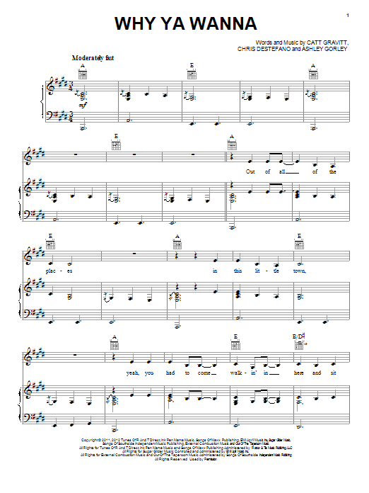 Download or print Jana Kramer Why Ya Wanna sheet music, chords and digital score arranged for Piano, Vocal & Guitar Chords (Right-Hand Melody). This Pop score includes 9 page(s).