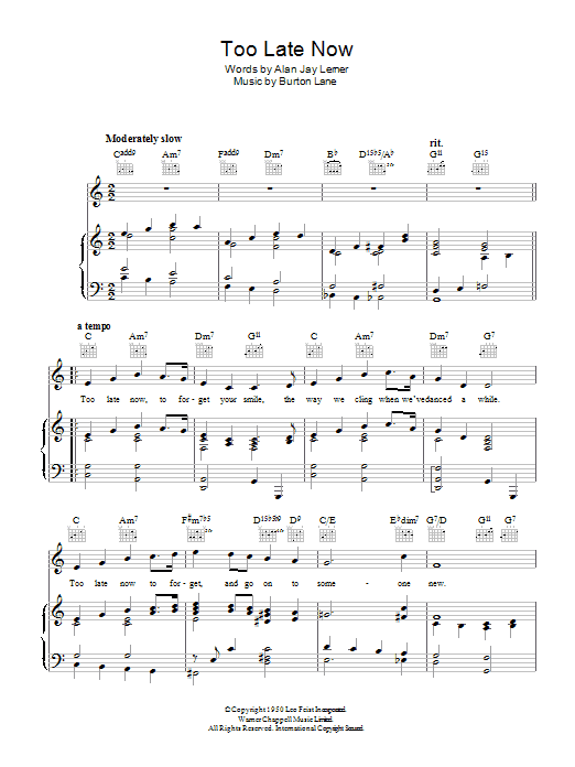Download or print Jane Powell Too Late Now sheet music, chords and digital score arranged for Piano, Vocal & Guitar Chords. This Film/TV score includes 3 page(s).
