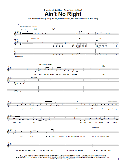Download or print Jane's Addiction Ain't No Right sheet music, chords and digital score arranged for Guitar Tab. This Alternative score includes 7 page(s).
