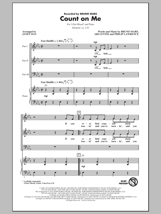 Download or print Bruno Mars Count On Me (arr. Janet Day) sheet music, chords and digital score arranged for 3-Part Mixed Choir. This Pop score includes 11 page(s).