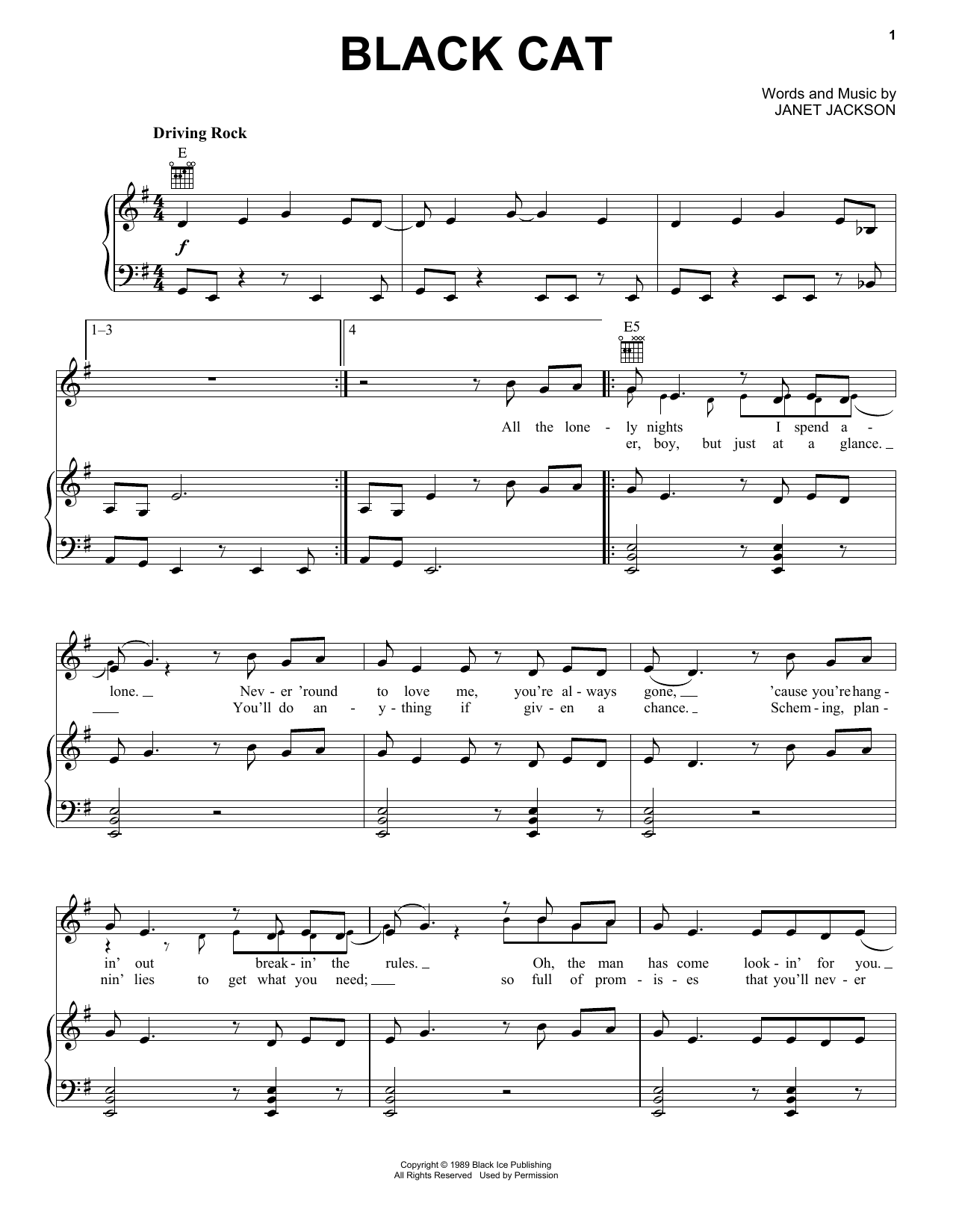 Download or print Janet Jackson Black Cat sheet music, chords and digital score arranged for Piano, Vocal & Guitar Chords (Right-Hand Melody). This Pop score includes 5 page(s).