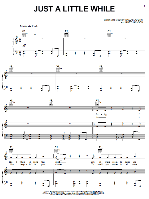 Download or print Janet Jackson Just A Little While sheet music, chords and digital score arranged for Piano, Vocal & Guitar Chords (Right-Hand Melody). This Pop score includes 6 page(s).