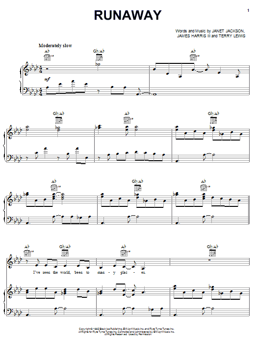 Download or print Janet Jackson Runaway sheet music, chords and digital score arranged for Piano, Vocal & Guitar Chords (Right-Hand Melody). This Pop score includes 5 page(s).