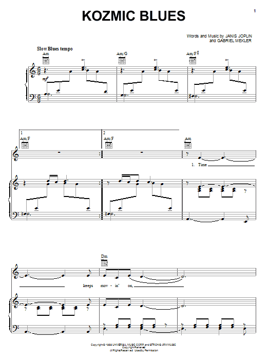 Download or print Janis Joplin Kozmic Blues sheet music, chords and digital score arranged for Piano, Vocal & Guitar Chords (Right-Hand Melody). This Blues score includes 6 page(s).