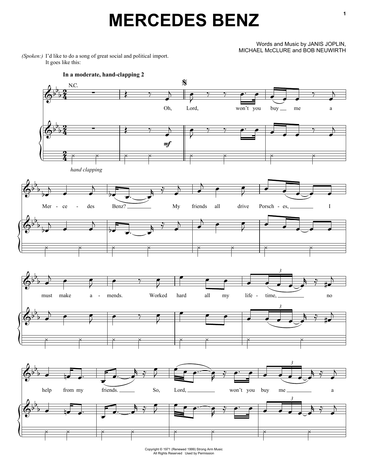 Download or print Janis Joplin Mercedes Benz (from the musical A Night With Janis Joplin) sheet music, chords and digital score arranged for Piano, Vocal & Guitar Chords (Right-Hand Melody). This Pop score includes 3 page(s).