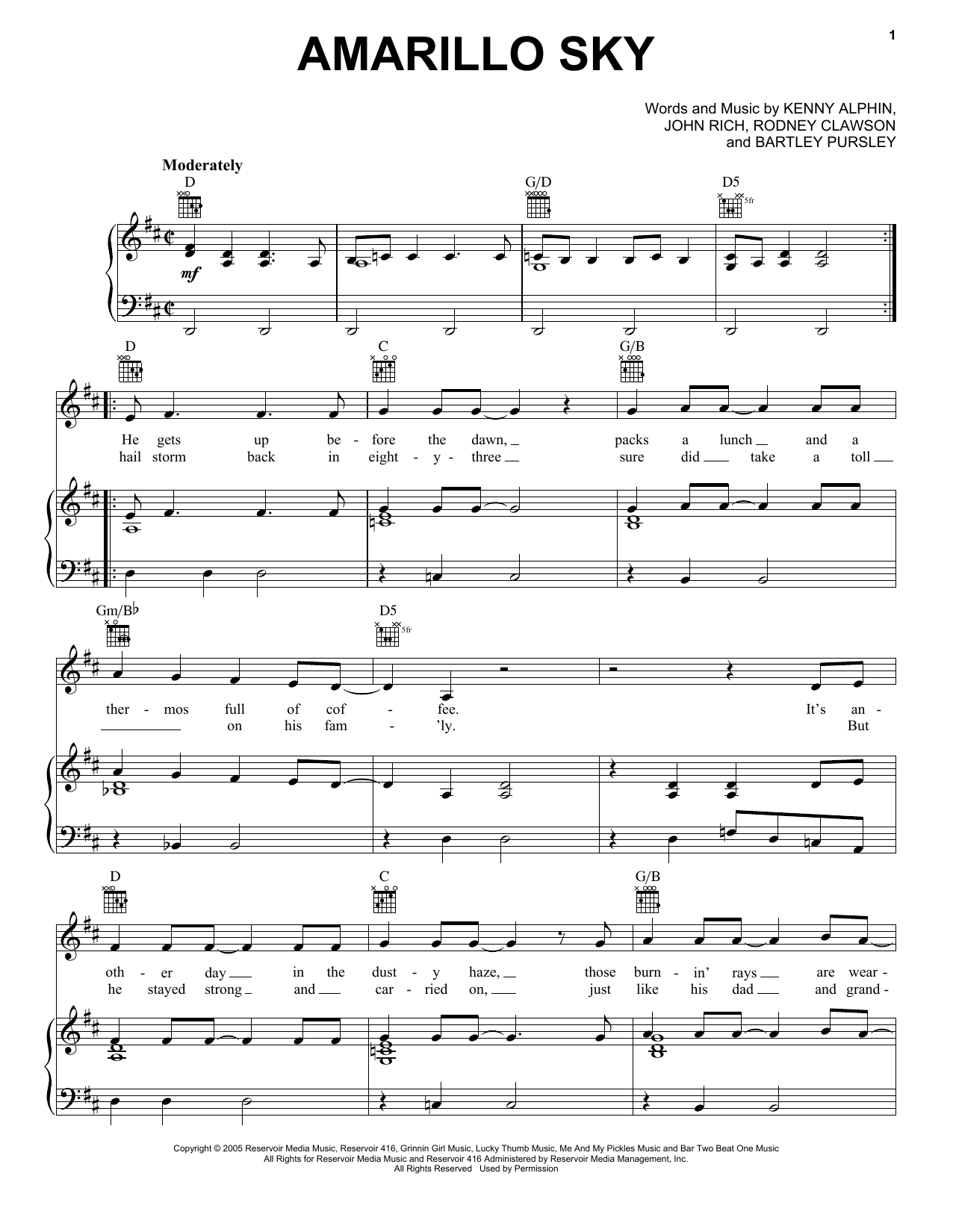 Download or print Jason Aldean Amarillo Sky sheet music, chords and digital score arranged for Piano, Vocal & Guitar Chords (Right-Hand Melody). This Country score includes 6 page(s).