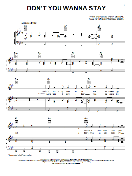 Download or print Jason Aldean featuring Kelly Clarkson Don't You Wanna Stay sheet music, chords and digital score arranged for Piano, Vocal & Guitar Chords (Right-Hand Melody). This Country score includes 7 page(s).