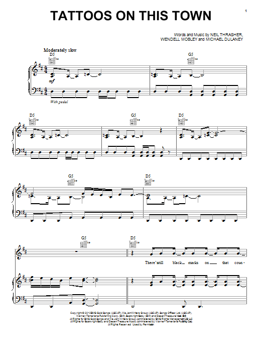 Download or print Jason Aldean Tattoos On This Town sheet music, chords and digital score arranged for Piano, Vocal & Guitar Chords (Right-Hand Melody). This Country score includes 8 page(s).
