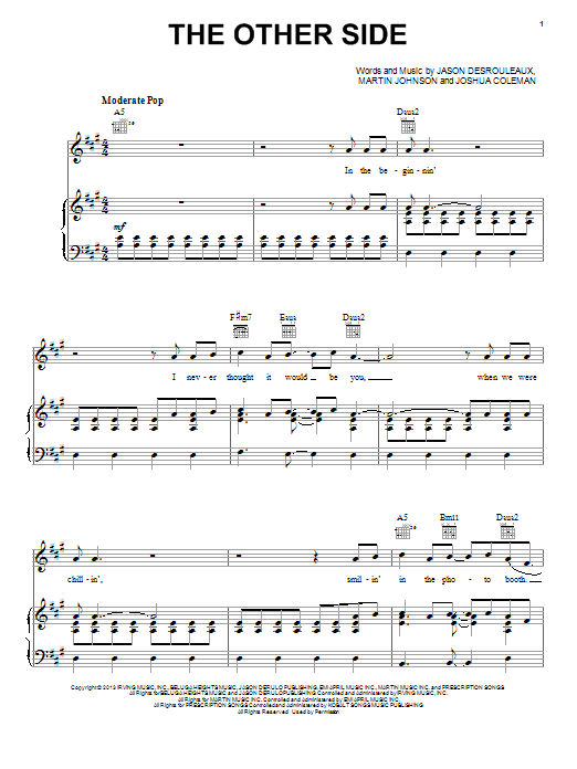 Download or print Jason Derulo The Other Side sheet music, chords and digital score arranged for Piano, Vocal & Guitar Chords (Right-Hand Melody). This Pop score includes 6 page(s).
