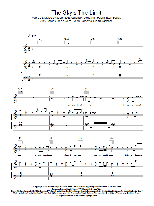 Download or print Jason Derulo The Sky's The Limit sheet music, chords and digital score arranged for Piano, Vocal & Guitar Chords. This Pop score includes 7 page(s).