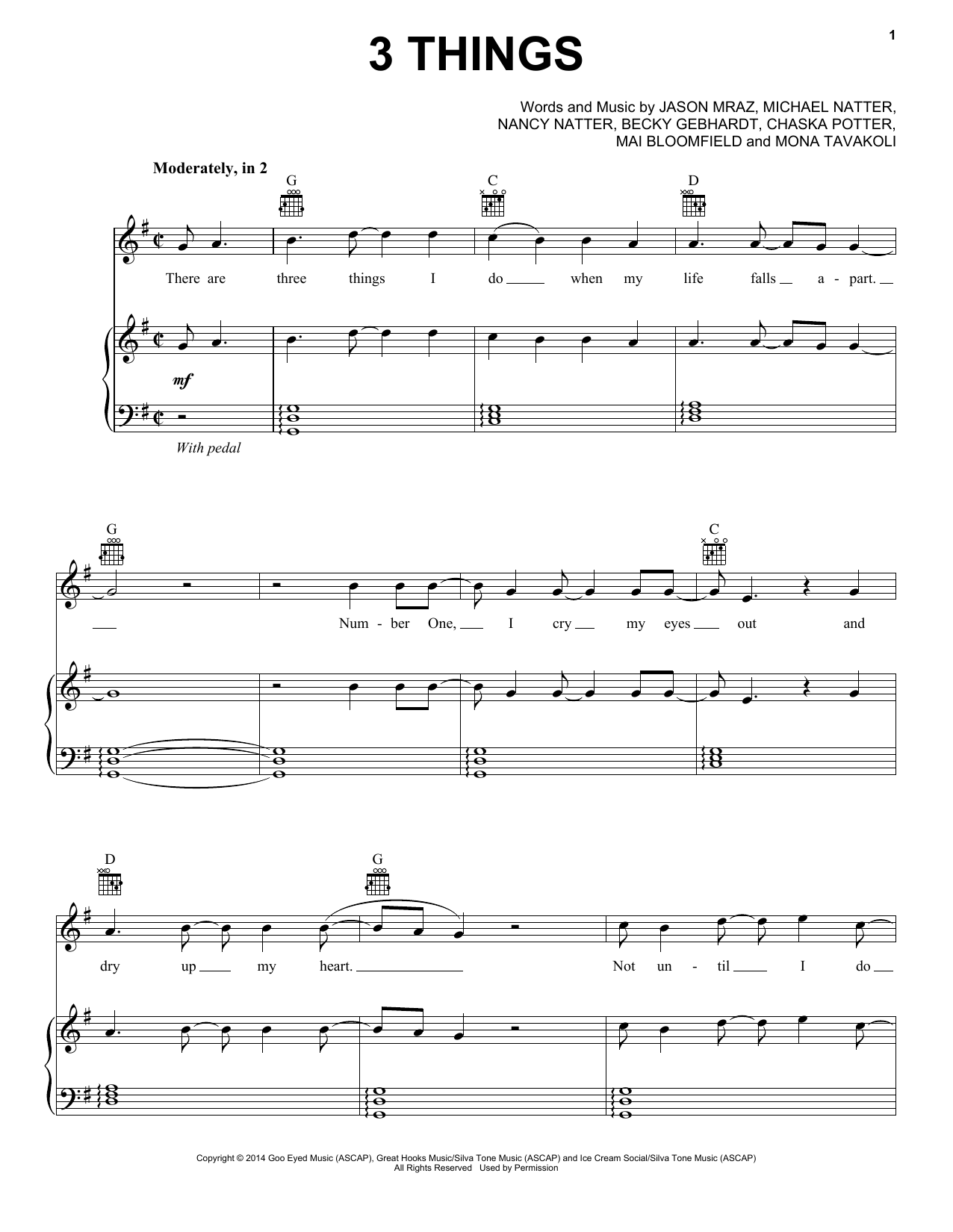 Download or print Jason Mraz 3 Things sheet music, chords and digital score arranged for Piano, Vocal & Guitar Chords (Right-Hand Melody). This Pop score includes 9 page(s).