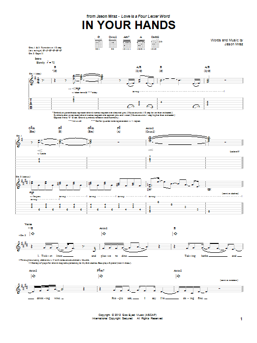 Download or print Jason Mraz In Your Hands sheet music, chords and digital score arranged for Guitar Tab. This Pop score includes 14 page(s).