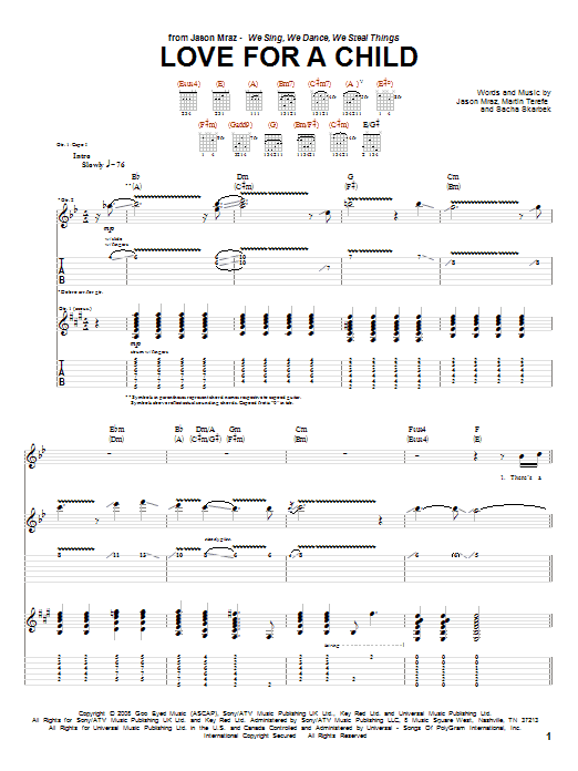 Download or print Jason Mraz Love For A Child sheet music, chords and digital score arranged for Guitar Tab. This Pop score includes 9 page(s).