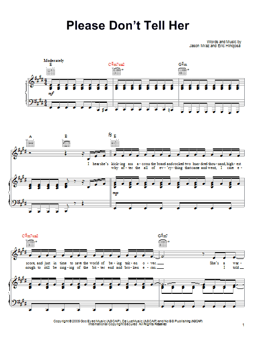 Download or print Jason Mraz Please Don't Tell Her sheet music, chords and digital score arranged for Guitar Chords/Lyrics. This Rock score includes 4 page(s).