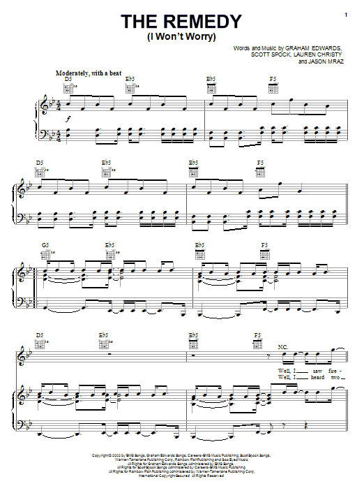 Download or print Jason Mraz The Remedy (I Won't Worry) sheet music, chords and digital score arranged for Guitar Chords/Lyrics. This Rock score includes 4 page(s).