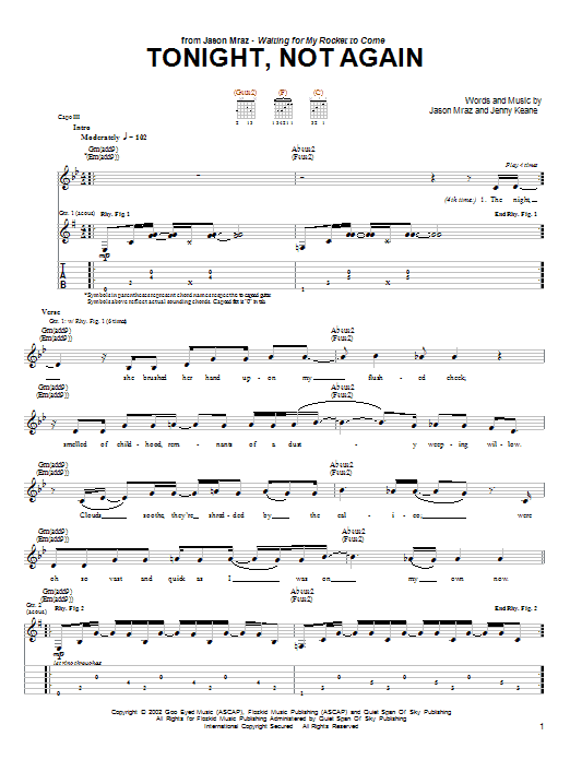 Download or print Jason Mraz Tonight, Not Again sheet music, chords and digital score arranged for Guitar Tab. This Pop score includes 8 page(s).