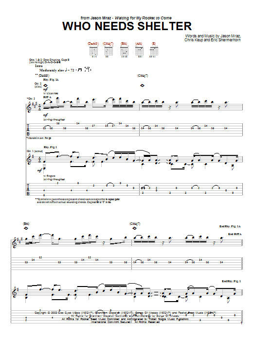 Download or print Jason Mraz Who Needs Shelter sheet music, chords and digital score arranged for Guitar Chords/Lyrics. This Rock score includes 3 page(s).