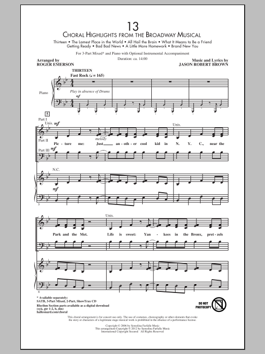 Download or print Jason Robert Brown 13 (Choral Highlights From The Broadway Musical) (arr. Roger Emerson) sheet music, chords and digital score arranged for 3-Part Mixed Choir. This Pop score includes 52 page(s).