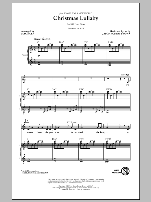 Download or print Jason Robert Brown Christmas Lullaby (from Songs for a New World) (arr. Mac Huff) sheet music, chords and digital score arranged for SAB Choir. This Christmas score includes 11 page(s).