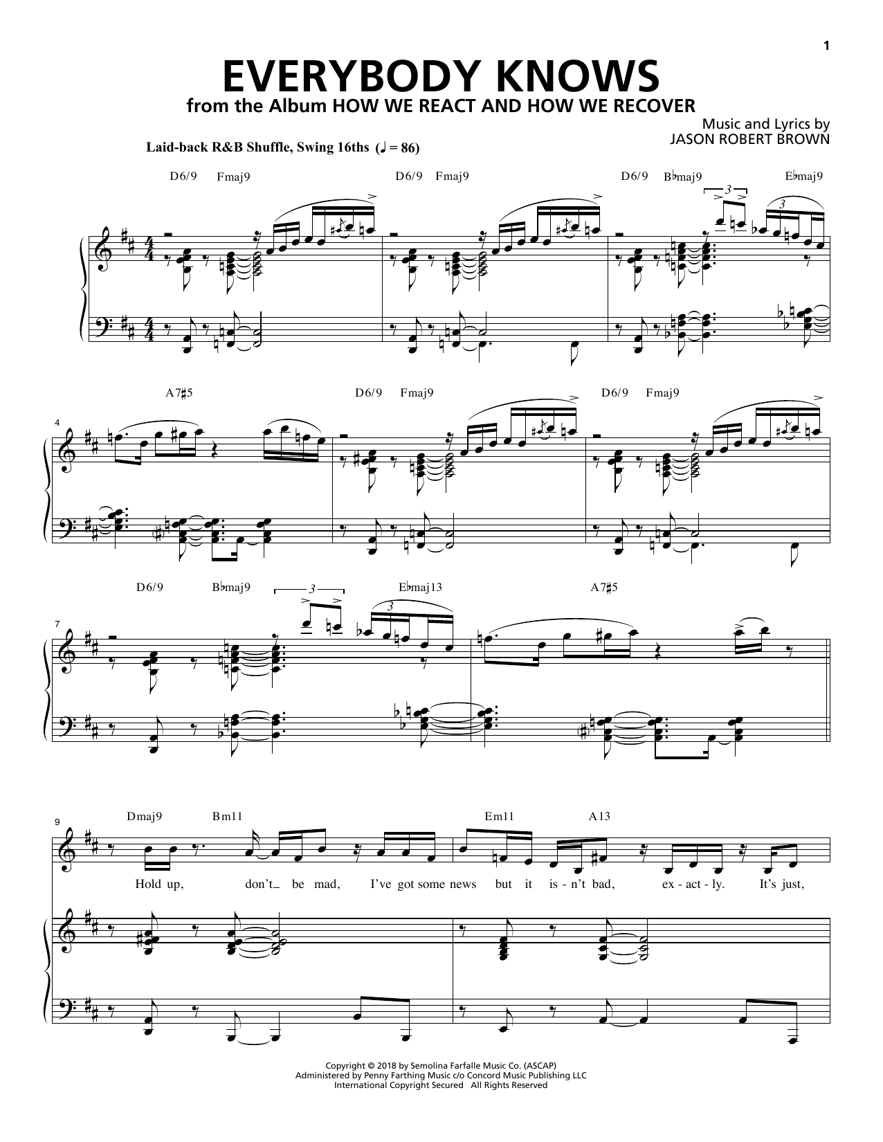 Download or print Jason Robert Brown Everybody Knows (from How We React And How We Recover) sheet music, chords and digital score arranged for Piano & Vocal. This Pop score includes 12 page(s).