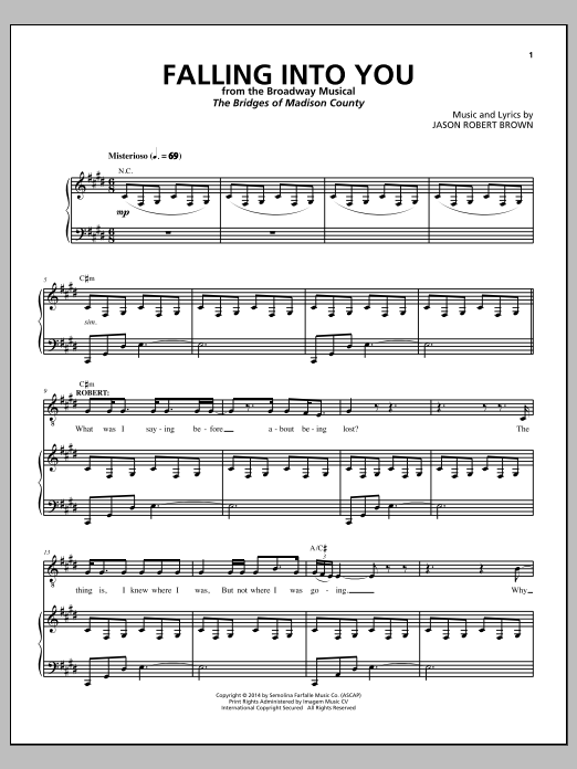 Download or print Jason Robert Brown Falling Into You (from The Bridges of Madison County) sheet music, chords and digital score arranged for Piano & Vocal. This Film/TV score includes 8 page(s).
