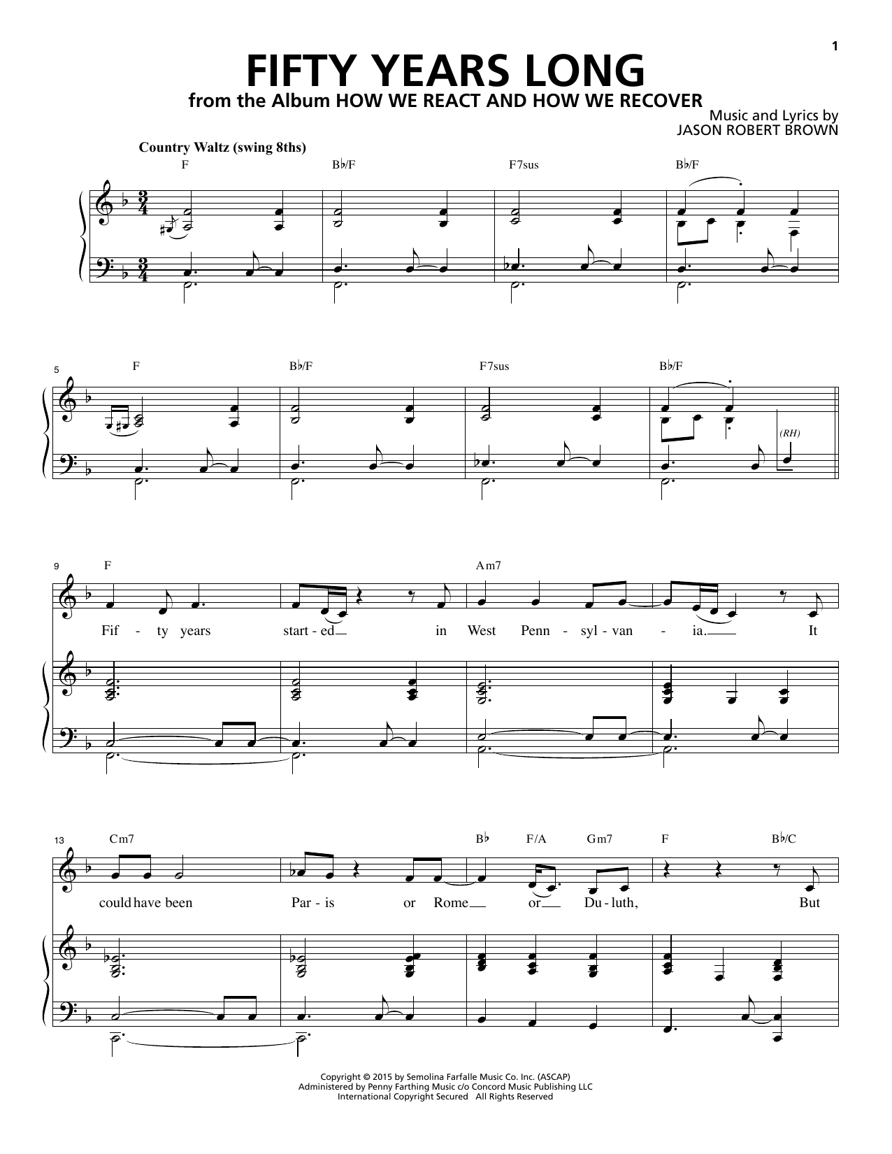Download or print Jason Robert Brown Fifty Years Long (from How We React And How We Recover) sheet music, chords and digital score arranged for Piano & Vocal. This Musical/Show score includes 9 page(s).