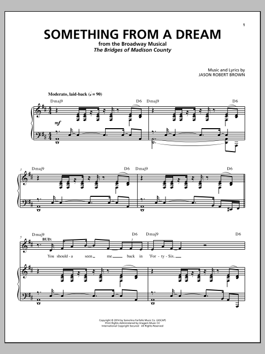 Download or print Jason Robert Brown Something From A Dream (from The Bridges of Madison County) sheet music, chords and digital score arranged for Piano & Vocal. This Pop score includes 8 page(s).