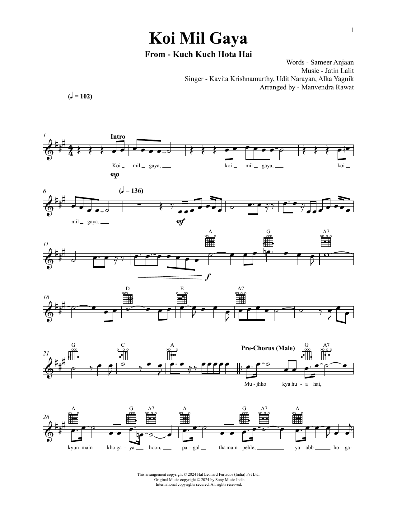 Download or print Jatin-Lalit, Udit Narayan and Alka Yagnik Koi Mil Gaya (from Kuch Kuch Hota Hai) sheet music, chords and digital score arranged for Lead Sheet / Fake Book. This Hindi score includes 5 page(s).
