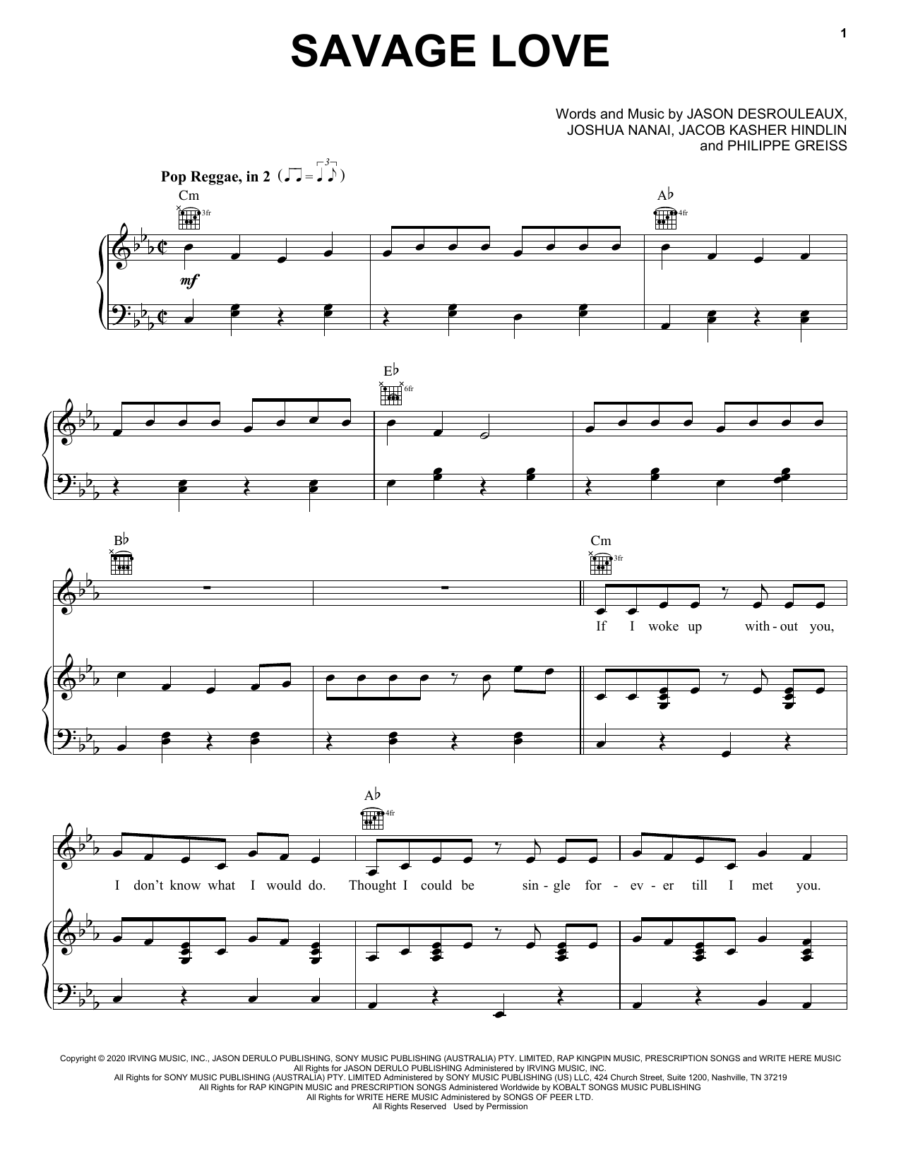 Download or print Jawsh 685 x Jason Derulo Savage Love sheet music, chords and digital score arranged for Very Beginner Piano. This Pop score includes 2 page(s).