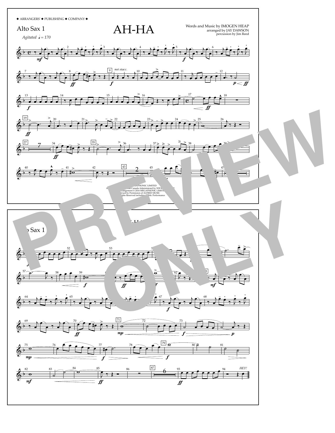 Download or print Jay Dawson Ah-ha - Alto Sax 1 sheet music, chords and digital score arranged for Marching Band. This Pop score includes 1 page(s).