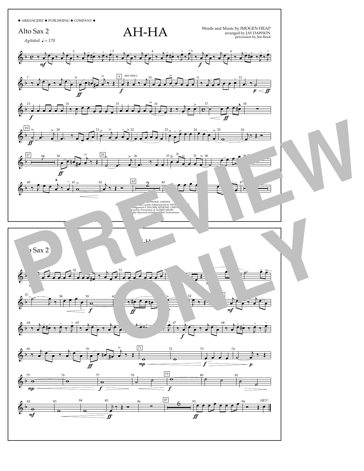Download or print Jay Dawson Ah-ha - Alto Sax 2 sheet music, chords and digital score arranged for Marching Band. This Pop score includes 1 page(s).