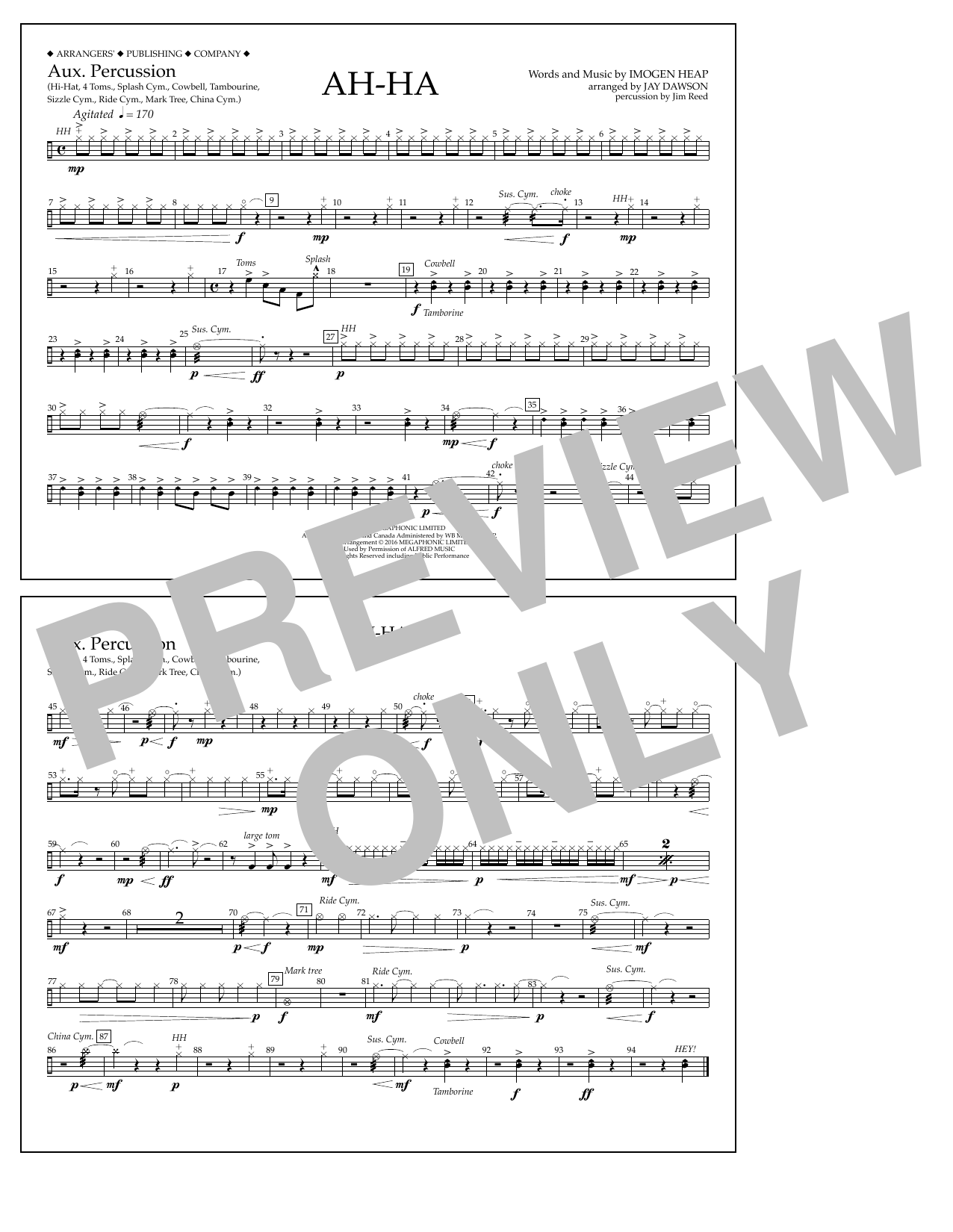 Download or print Jay Dawson Ah-ha - Aux. Percussion sheet music, chords and digital score arranged for Marching Band. This Pop score includes 1 page(s).