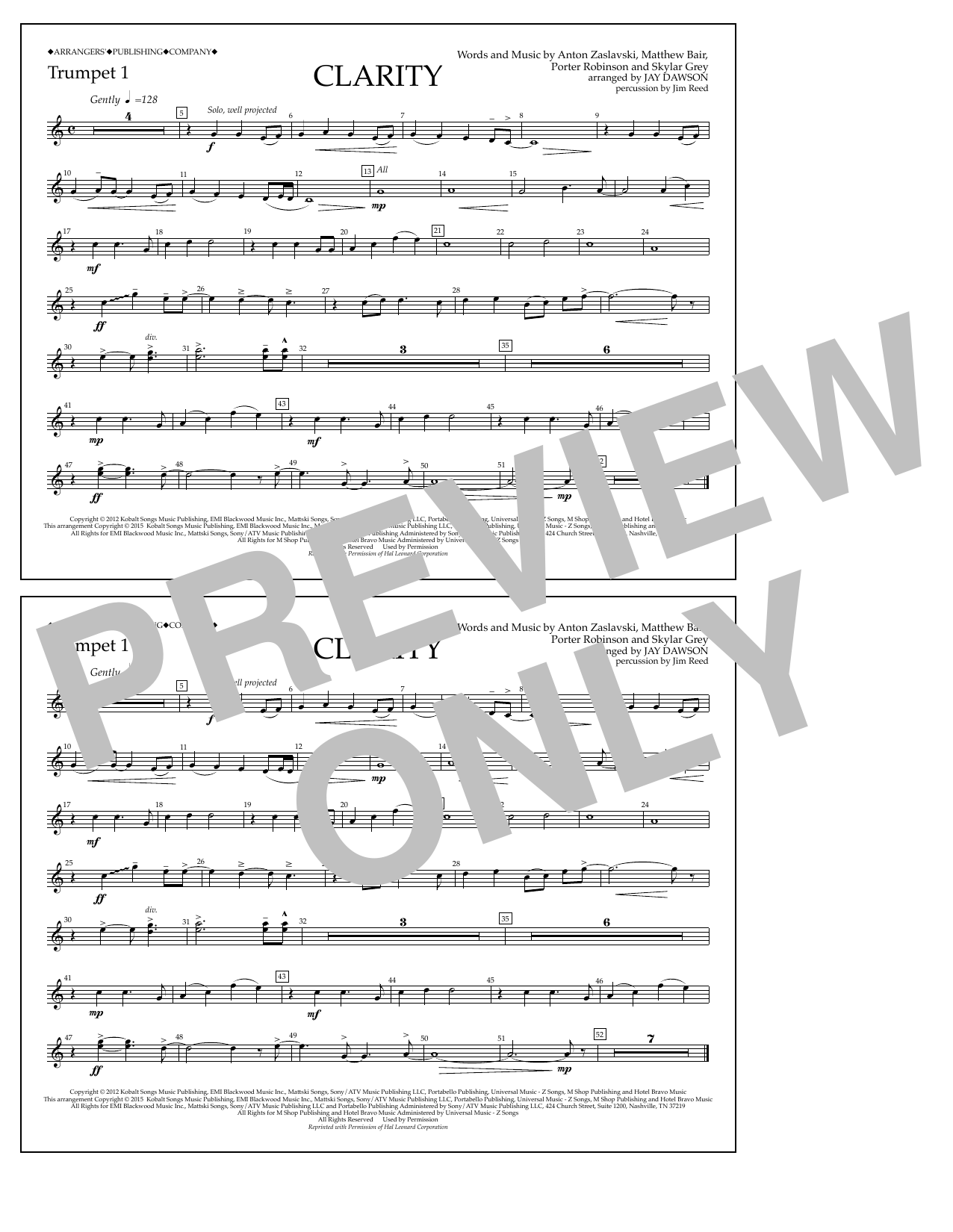 Download or print Jay Dawson Clarity - Trumpet 1 sheet music, chords and digital score arranged for Marching Band. This Pop score includes 1 page(s).