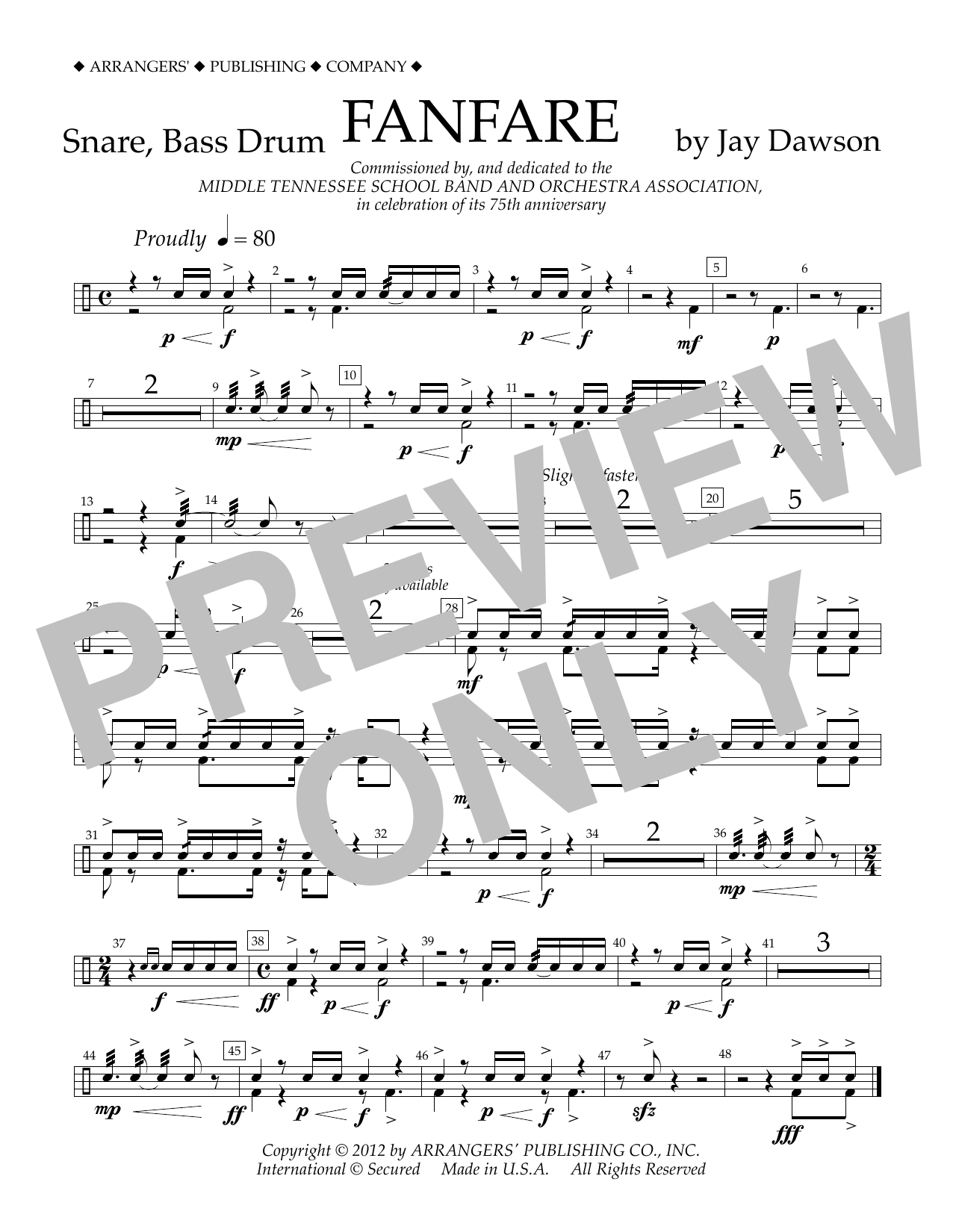 Download or print Jay Dawson Fanfare - Snare, Bass Drum sheet music, chords and digital score arranged for Concert Band. This Concert score includes 1 page(s).