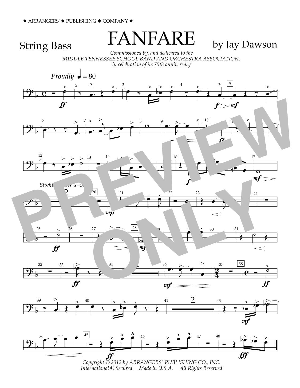 Download or print Jay Dawson Fanfare - String Bass sheet music, chords and digital score arranged for Concert Band. This Concert score includes 1 page(s).