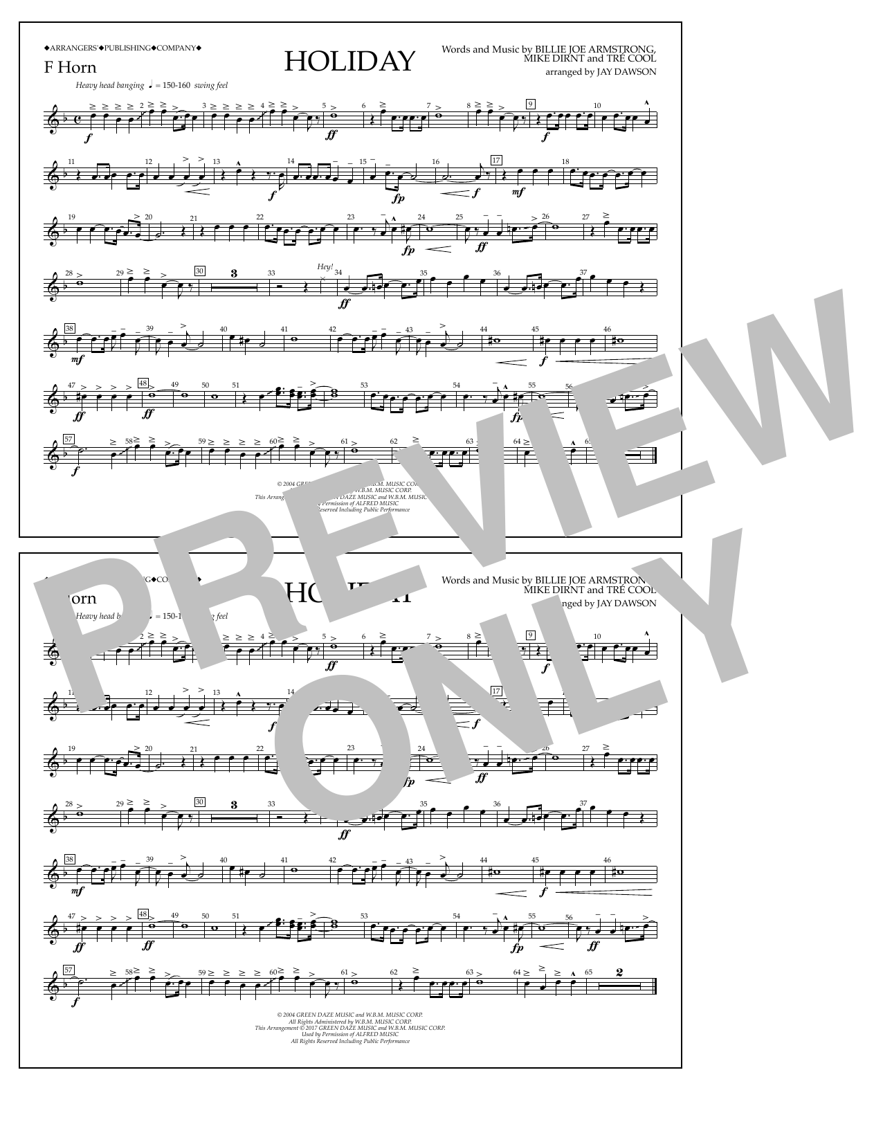 Download or print Jay Dawson Holiday - F Horn sheet music, chords and digital score arranged for Marching Band. This Pop score includes 1 page(s).