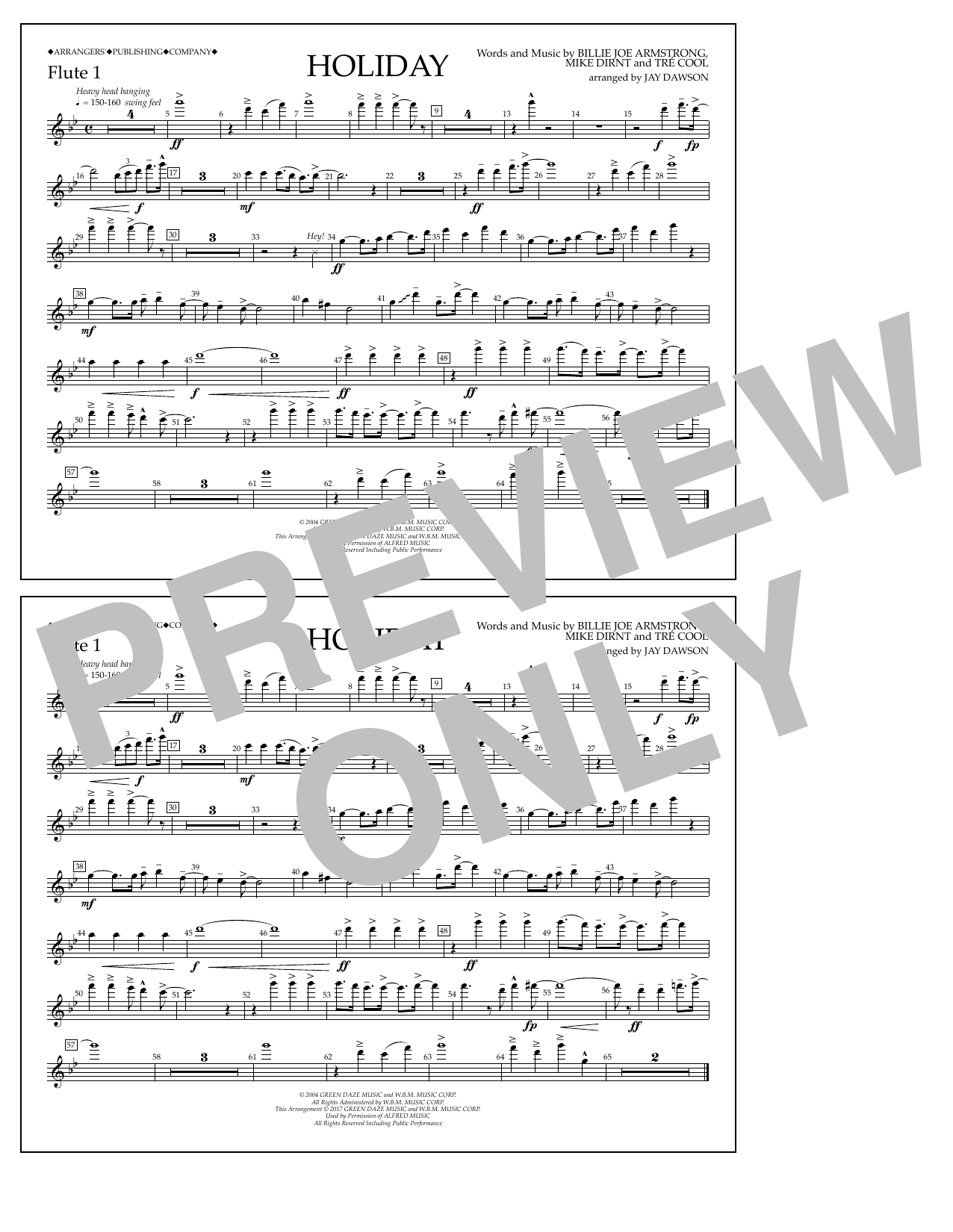 Download or print Jay Dawson Holiday - Flute 1 sheet music, chords and digital score arranged for Marching Band. This Pop score includes 1 page(s).