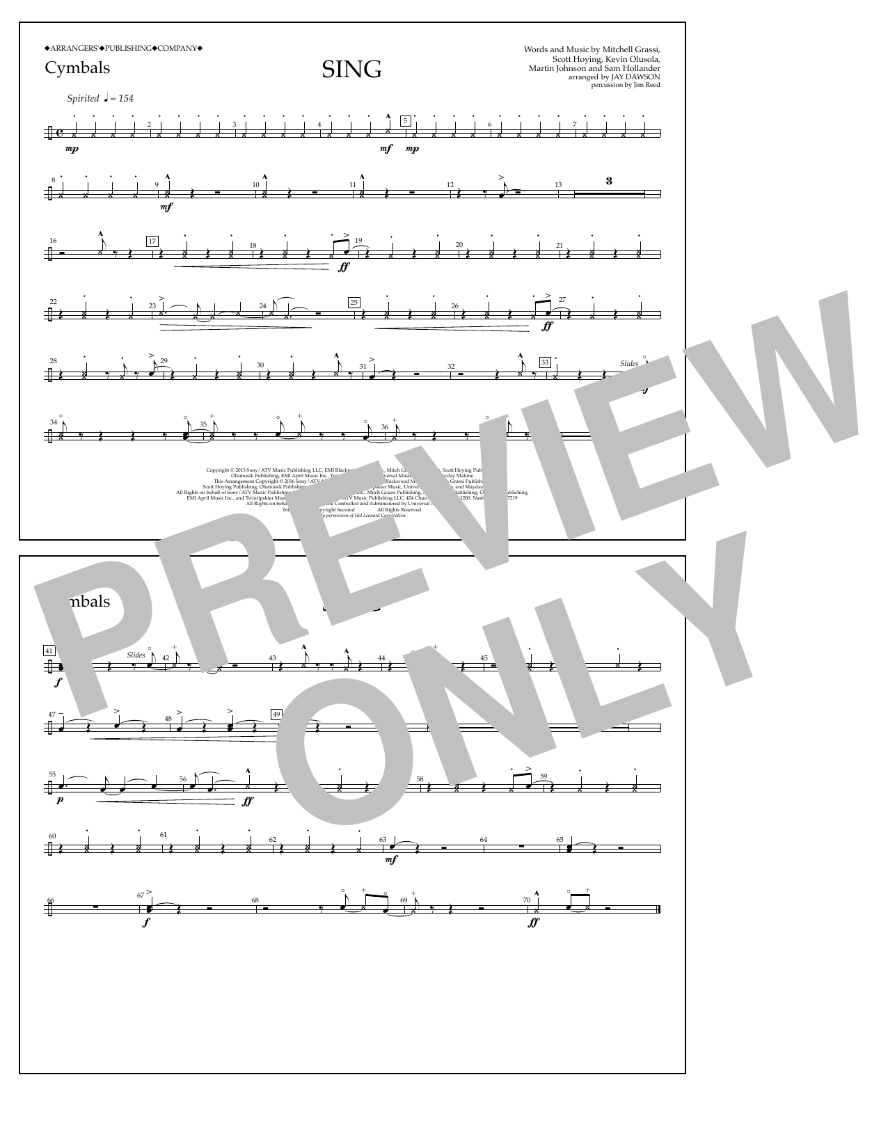 Download or print Jay Dawson Sing - Cymbals sheet music, chords and digital score arranged for Marching Band. This Pop score includes 1 page(s).