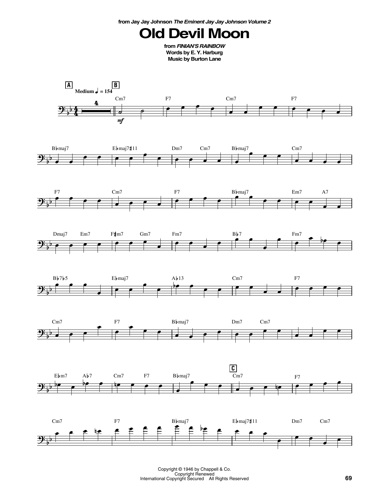 Download or print Jay Jay Johnson Old Devil Moon sheet music, chords and digital score arranged for String Bass Transcription. This Jazz score includes 4 page(s).